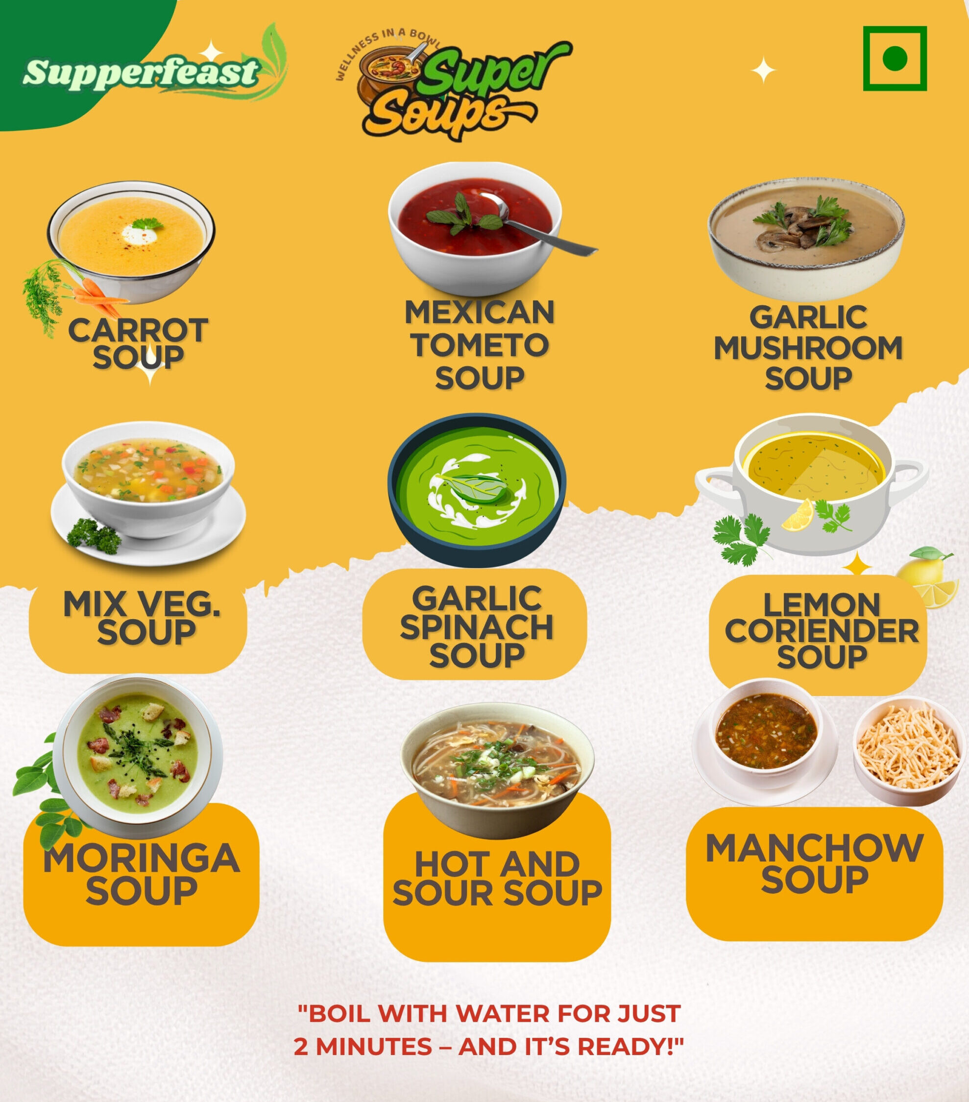Mix Veg. Soup Premix Garlic Spinach Soup Premix Carrot Soup Premix Veg. Manchow Soup Premix Hot N Sour Soup Premix Moringa Soup Premix Lemon Coriander Soup Premix Mexican Tomato Soup Premix Garlic Mushroom Soup Premix